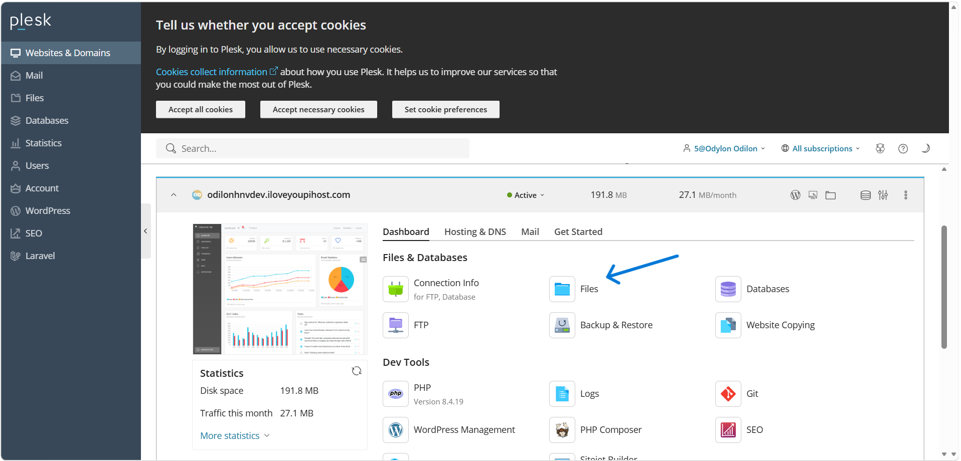 Depuis le tableau de bord de votre domaine sur Plesk, repérez la section "Files & Databases".