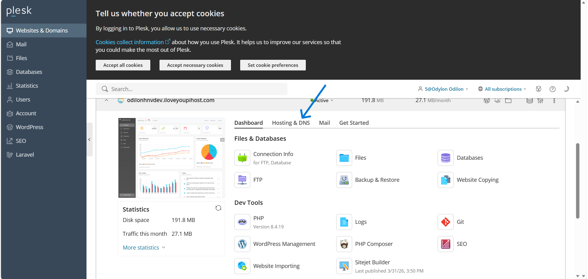 Dans le menu supérieur de Plesk, cliquez sur l'onglet "Hosting & DNS".
