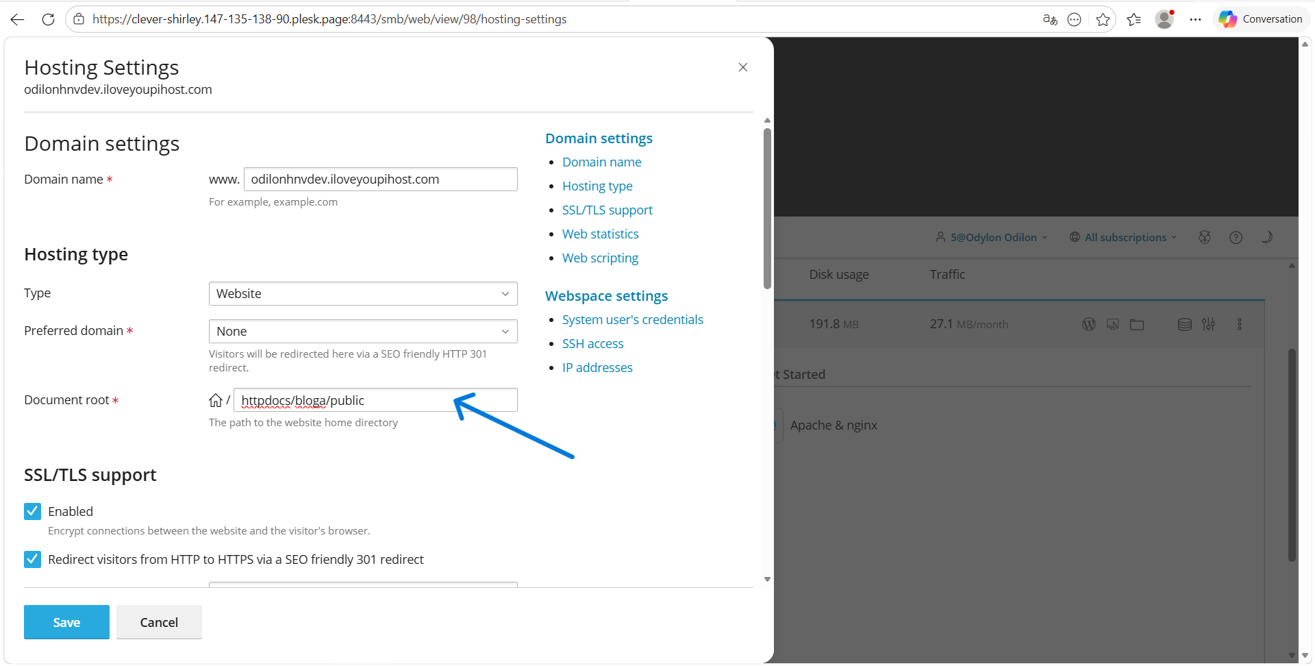 Cliquez sur le bouton/modifier "Hosting" (ou sur la configuration actuelle du domaine).