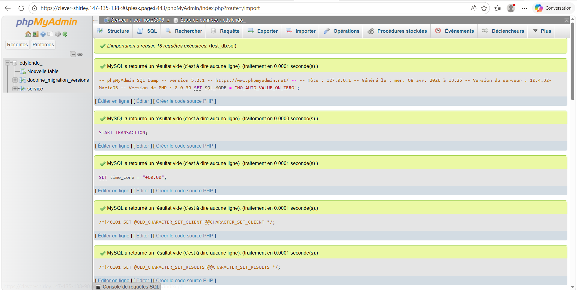 Une fois le processus terminé, un message de succès vert s'affichera en haut de la page : "L'importation a réussi, 18 requêtes exécutées. (test_db.sql)".