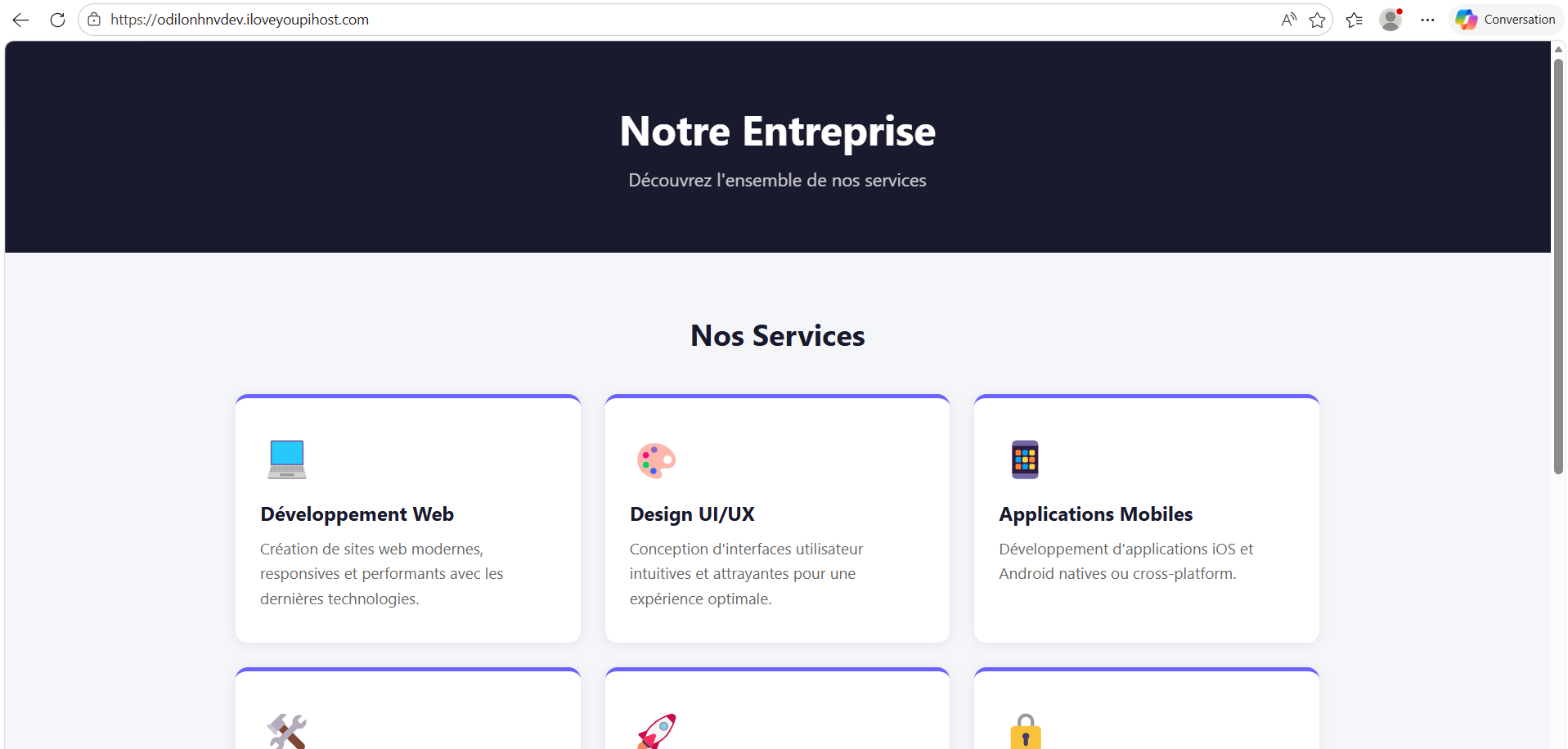 Si le point d'entrée (Document Root) et la base de données sont correctement configurés, votre application Symfony s'affichera. Vous devriez voir la page d'accueil de votre projet (par exemple, la page présentant "Notre Entreprise" et les modules "Développement Web", "Design UI/UX", etc.).