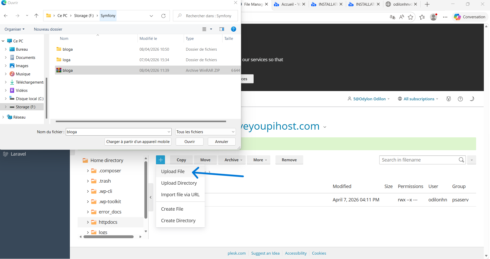 Sélectionnez le fichier bloga.zip dans le gestionnaire.
