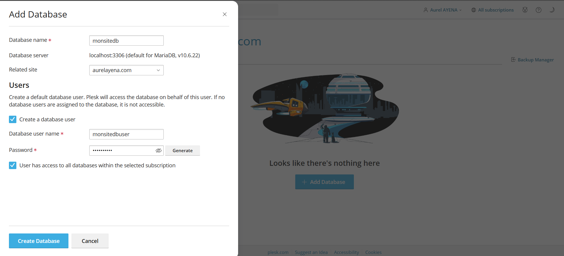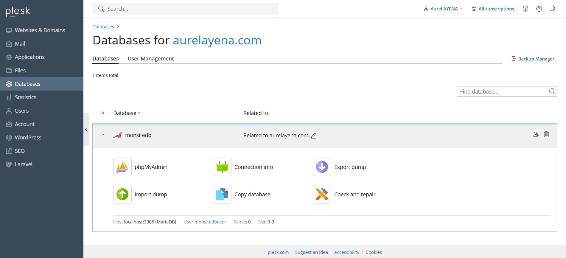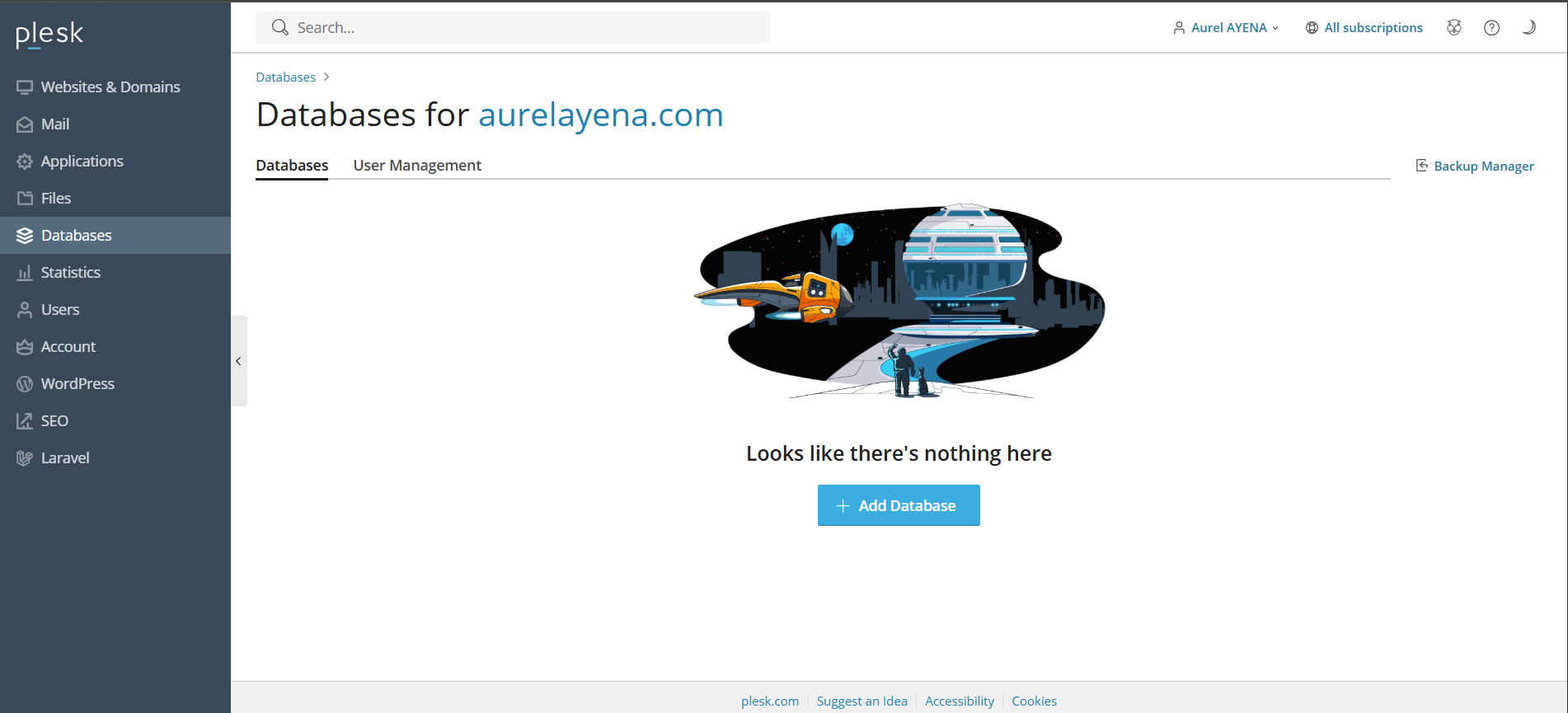 Si votre projet nécessite une base de données, retournez dans le menu de gauche de Plesk et cliquez sur l'option "Databases".