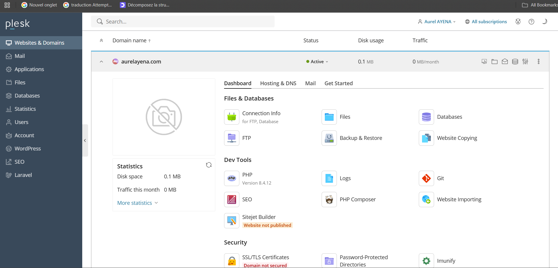Dans la barre latérale de Plesk, cliquez sur "Websites & Domains" pour voir toutes les options offertes par votre plan d'hébergement.