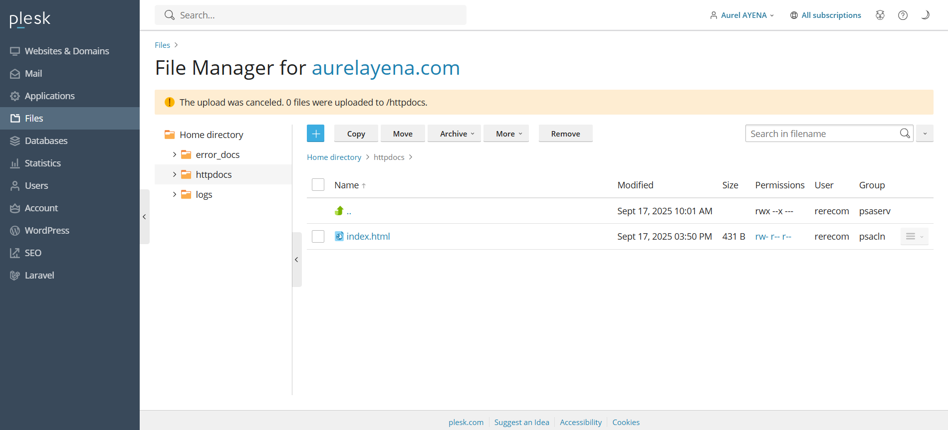 Vous verrez un répertoire contenant un fichier index.html par défaut. Pour installer votre propre projet, vous devez d'abord supprimer ce fichier en le sélectionnant et en cliquant sur le bouton "Supprimer".