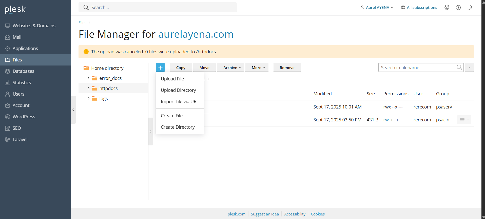 Depuis l'interface précédente, cliquez sur "Files" pour accéder au gestionnaire de fichiers de votre hébergement.
